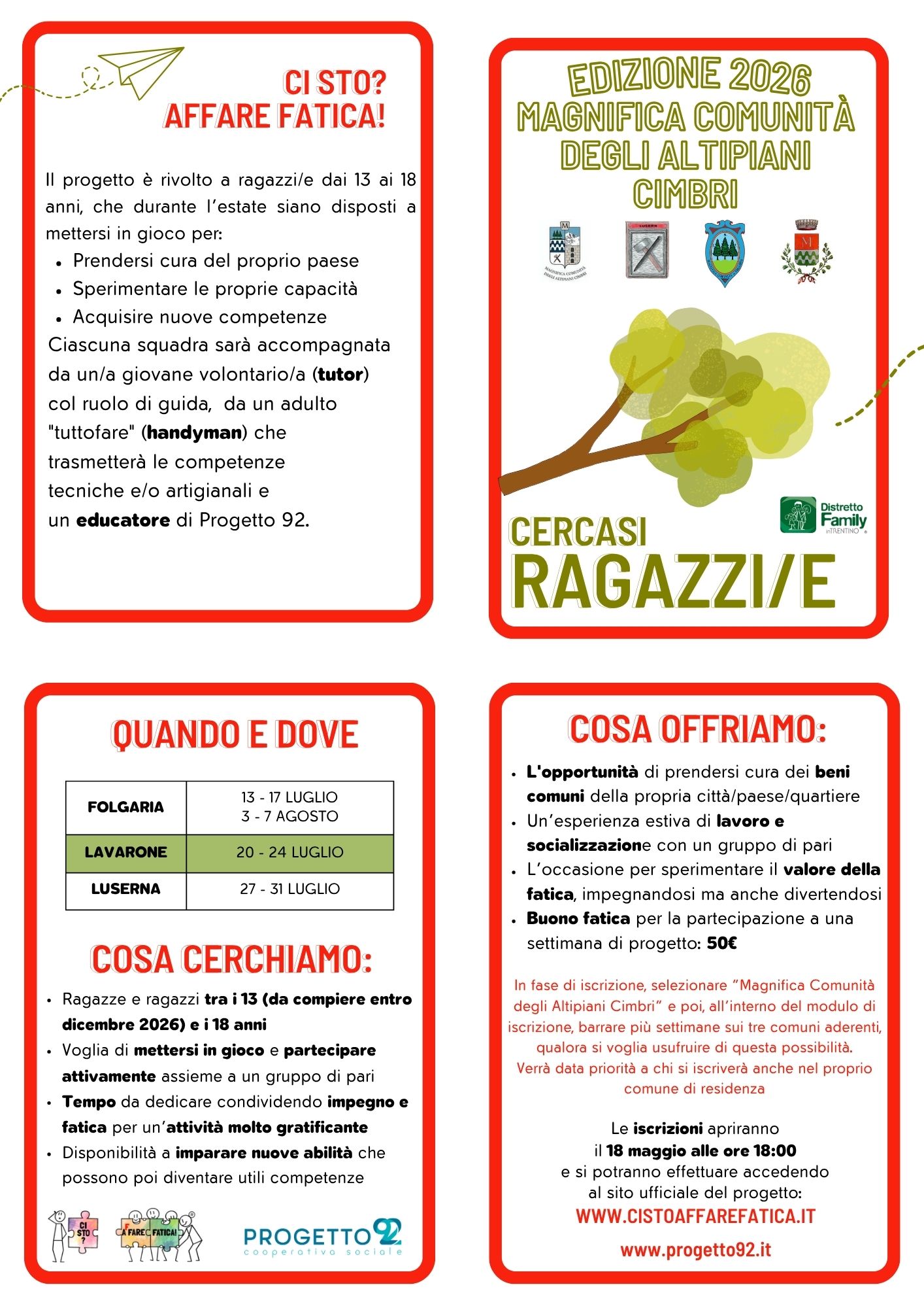 - Iscrizioni: Online su www.cistoaffarefatica.it dal 18 al 31 maggio 2026, selezionando "Magnifica Comunità degli Altipiani Cimbri"