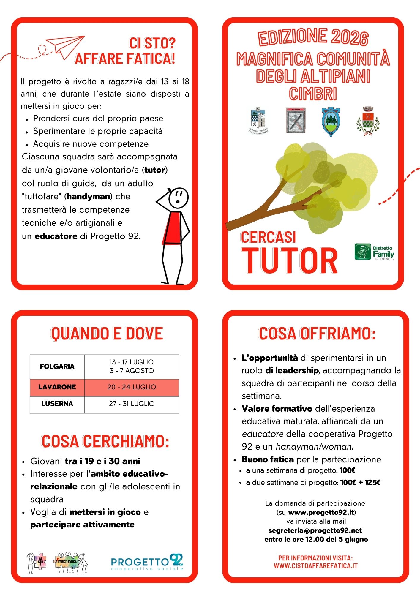 - Candidature: invio del CV a segreteria@progetto92.net entro le ore 12:00 del 5 giugno 2026